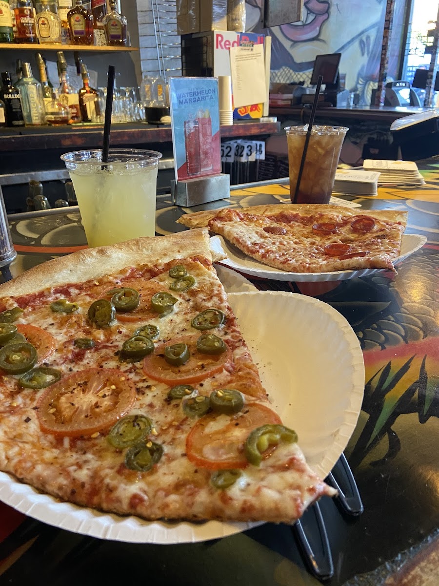 Such a cool pizza place! The slices are HUGE! Well worth the price. The art is fun to look at. Game on TV, jukebox, and the service person was very nice. Highly recommend!